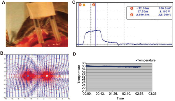 Figure 1: Pulse delivery assembly and nsPEF treatment. A pair of needle electrodes were used to deliver electric field into the tumor. They were electrically insulated 1cm from tip (Figure 1A). The distance in between was 2cm. The electric field distribution was not uniform and formed an oval ablation zone (Figure 1B). The machine generated the highest 40 kV/cm-electric field in the center (Figure 1C). The tumor temperature during treatment was lower than 40°C (Figure 1D).