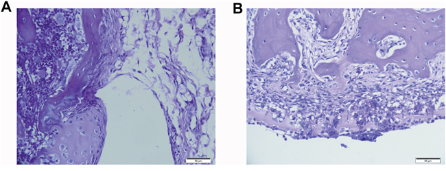 Figure 5: Pathology of dog joint capsule. The dog joint capsule was stained by H&E. The puncture electrode pierced the capsule and caused infection after ablation (Figure 5A). Four weeks post treatment, the puncture site showed no infection or joint deformity (Figure 5B). Scale bar 50μm.