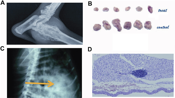 Figure 6: The radiology and pathology of the primary tumor and lung metastasis. The primary tumor of canine osteosarcoma (Figure 6A). The primary tumor of murine HCC (Figure 6B). Canine spontaneous osteosarcoma spread to the lung as multiple rounded nodules (Figure 6C). After ablation, the lung metastasis clusters were inhibited as a focal diameter smaller than 1 cm (Figure 6D). (Scale bar 500μm).