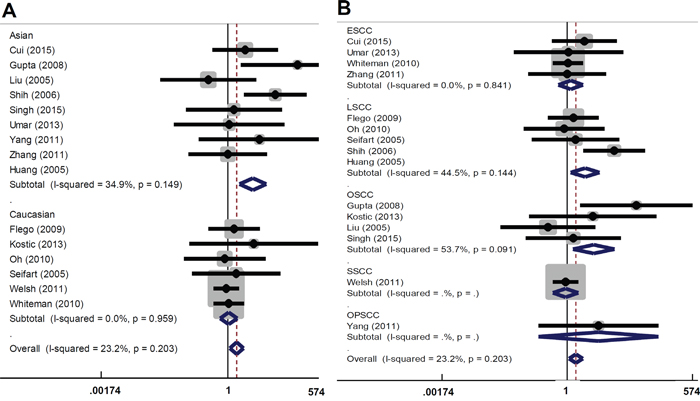 For the rs361525 polymorphism and SCC risk, random-effect model was used for the overall SCC, due to the presence of overall significant heterogeneity (Table 6, all I2>50 %, Pheterogeneity<0.05). For the rs1800629 polymorphism and the risk of skin cancer, fixed-effect model was used for all models (Table 6, all I2 < 50 %, Pheterogeneity >0.05).