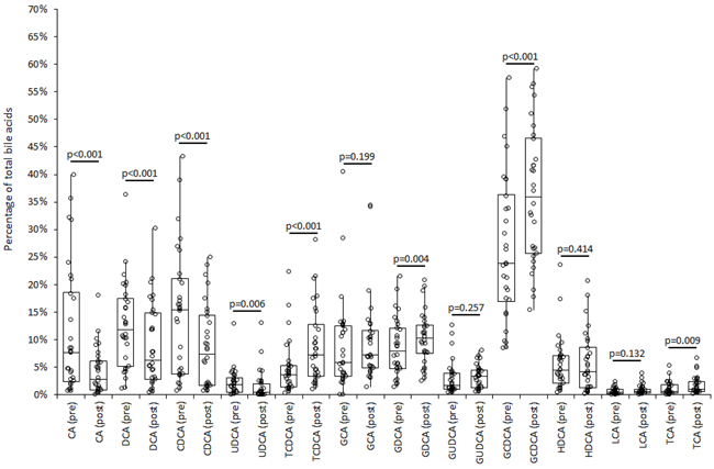 Figure 1: Composition of bile acids profile in serum immediately before (“pre”) and shortly after (“post”) middle distance running in 30 adult recreational athletes. CA, cholic acid; DCA, deoxycholic acid; CDCA, chenodeoxycholic acid; UDCA, ursodeoxycholic acid; TCDCA, taurochenodeoxycholic acid; GA, glycocholic acid; GCDCA, glycochenodeoxycholic acid; GUDCA, glycoursodeoxycholic acid; HDCA, hyodeoxycholic acid; GDCA, glycodeoxycholic acid; LCA, lithocholic acid; TCA, taurocholic acid.