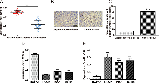 Figure 1: The expressions of miR-199a-3p and Smad1 in prostate tissue samples. (A) Difference in the expression of miR-199a-3p between prostate cancer tissues and corresponding adjacent normal prostate tissues. Data were presented as mean ± SD. (B) Immunohistochemistry results showed the protein expression of Smad1 in prostate cancer tissues and cancer adjacent normal tissues. The red rectangles and black arrows have been pictured to direct Smad 1 positive staining (i.e. the brown colors). (C) Number of cases with positive Smad1 expressions. ***P < 0.001 compared with adjacent normal tissues. (D) The expression of miR-199a-3p in prostate cancer cell lines (i.e. LNCaP, PC-3 and DU145) and normal prostate epithelial cells (i.e. RWPE-1). ***P < 0.001 compared with RWPE-1. (E) The expression of Smad1 mRNA in prostate cancer cell lines (LNCaP, PC-3 and DU145) and normal prostate epithelial cells (i.e. RWPE-1). ***P < 0.001 compared with RWPE-1.