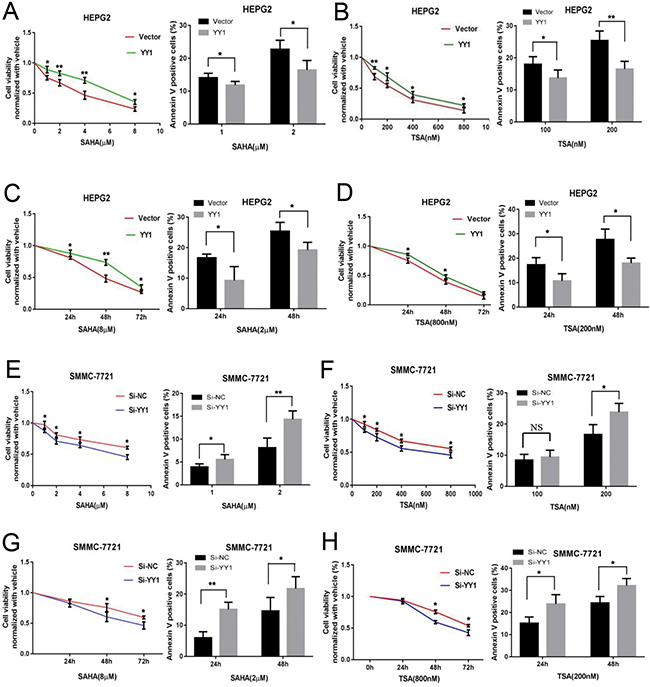 Figure 4: Effects of YY1 on the sensitivity of HCC cells to HDACi in vitro. SMMC-7721 cells were transfected with YY1-shRNA plasmids and HEPG2 cells were transfected with YY1 expressing plasmids. CCK8 and apoptosis assay were conducted in cells treated with SAHA (A, C, E and G) or TSA (B, D, F and H) under different drug concentrations at 72 h (A, B, E and F) or under fixed drug concentrations at different time points (C, D, G and H). *P < 0.05; **P < 0.01; NS, not significant.