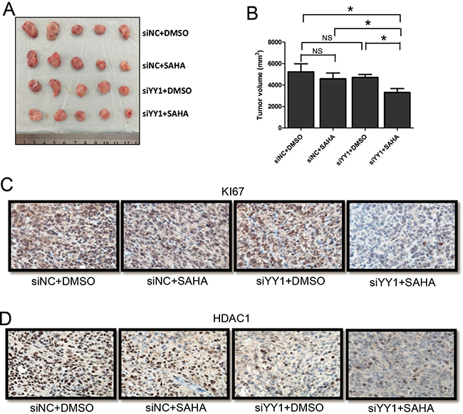 Figure 5: Effects of YY1 on the sensitivity of HCC cells to HDACi in vivo. (A) Morphologic characteristics of tumors from HCC xenograft mice with different treatments were shown. (B) Sizes of tumors from mice were calculated and compared in the diagrams. (C and D) Expressions of KI67 (C) and HDAC1 (D) were examined by immunohistochemistry. *P < 0.05; NS, not significant.