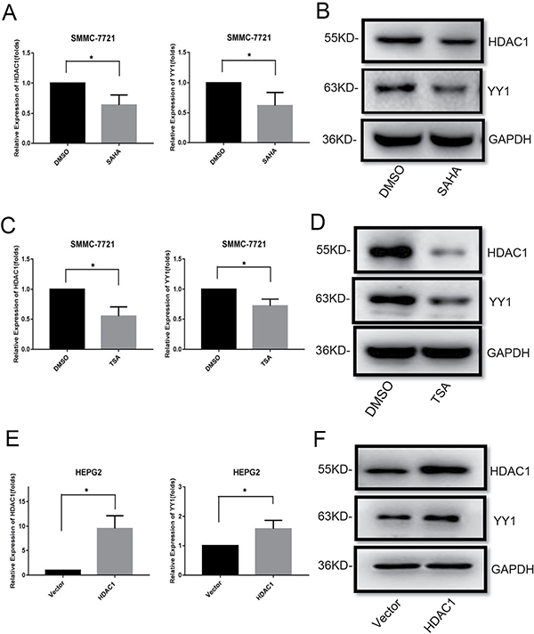 Figure 6: Effects of HDACi and HDAC1 on YY1 expression. QRT-PCR and western blot analysis of HDAC1 and YY1 expressions in SMMC-7721 cells treated with HDACis (8 μM SAHA and 800 nM TSA for 48 hours) (A–D) and HEPG2 cells with HDAC1 overexpression (E–F) were performed. *P < 0.05.