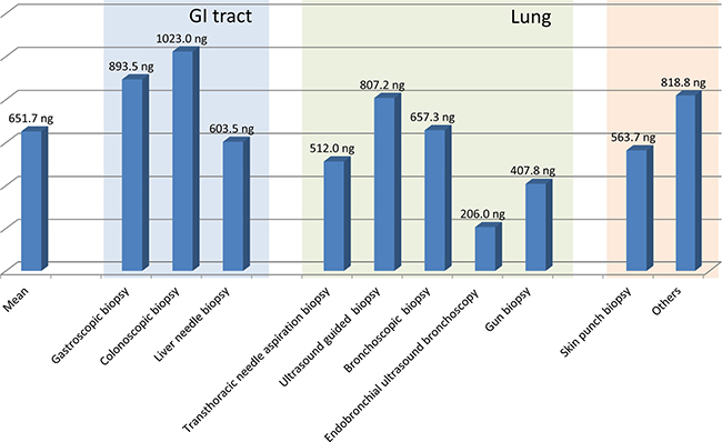 The mean DNA volume was 2431.2 ng as measured by Nanodrop. DNA amounts according to cancer sites and acquisition method were also compared. For size, yield of DNA per one fragment of endoscopic biopsy was calculated in a volume of 8 mm3. The mean DNA yield from one endoscopic biopsy piece (ng/8 mm3) was 651.7 ng. The mean DNA yield was generally low in the specimens from lung compared to those of the GI tract (Figure 1). Interestingly, the highest DNA yield was acquired from colonoscopic biopsies (1023 ng/8 mm3) followed by gastric biopsy (893.5 ng/8 mm3) and ultrasound guided lung biopsy (807.2 ng/8 mm3). The lowest DNA amount was obtained from EBUS lung biopsy (206 ng/8 mm3) (Figure 1). As expected, skin biopsy showed no failure in acquisition of DNA.