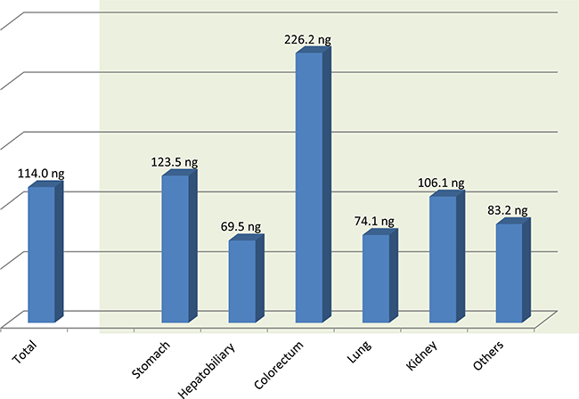 For the larger specimens obtained after surgery, the mean size of the specimen received was 2.0 × 1.0 cm, and the mean DNA yield per one unstained slide was 1800 ng. Therefore, theoretically only one unstained section of operation specimen would be enough for NGS if properly fixed. However, due to our lack of experience, 7.2 unstained slides were used far exceeding the minimum amount of tissue needed for successful DNA extraction. According to acquisition organ, the highest amount of DNA was obtained from the colorectum (2334 ng on mean), and the lowest amount was obtained from lung specimens (1439 ng on mean) (Table 3 and Figure 3). The difference is likely attributable to extensive hemorrhage and necrosis in the lung specimens as well as varying operation room protocols in how specimens are treated and triaged. For colorectal, gastric, and renal cell carcinomas, the specimens are immediately sent to the pathology department after removal for prompt fixation. For lung cancer cases, the relatively long operational time likely increases the cold ischemia time in the tumor after removal. This undoubtedly affects the amount and quality of the DNA that can be successfully extracted.