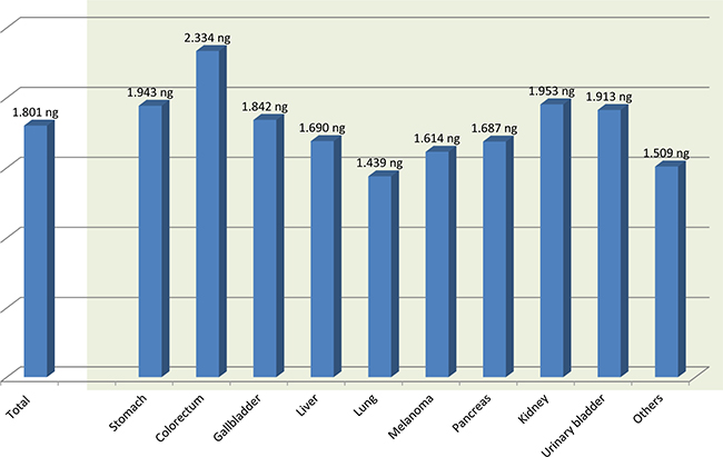 Figure 1: The mean DNA amount extracted from fresh frozen biopsy sample from different organs after adjustment to an endoscopic biopsy size (8 mm3).