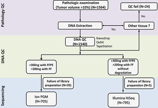 Although fairly extensive with a good sample size, this study has several limitations. First, DNA concentration in the current study was first measured by Nanodrop, and the results of Qubit were not provided in all cases. In general, DNA concentrations measured by Nanodrop are typically higher than Qubit. Qubit is then needed to ensure accurate DNA measurements, especially for degraded DNA from FFPE samples [13]. In many laboratories (including ours), samples are initially checked with Nanodrop and subsequently double checked with Qubit to ensure the accurate measurement of double-stranded DNA [13]. Caution is needed when interpreting DNA concentration of FFPE samples using the Nanodrop assay only. Second, the result of library QC, sequencing QC, and validation results are not provided in the present study and were published previously and In Press.(NEXT, The Oncologist) Input DNA amount can affect library yields and cause amplification bias [5]. In our institute, sequencing results of samples with unsatisfactory QC results were reported with a caveat of the possibility of false positive or negative results. Evaluating and validating variant call results of low quality samples will be explored in a further study.