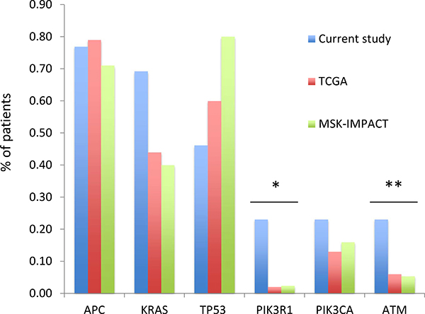 Mutation frequencies in the microsatellite stable (MSS) tumors were compared to those seen in the MSS CRC cases in the TCGA cohort (n = 189) as well as to those seen in CRC patients who underwent single-site tumor sequencing for clinical purposes at our institution (n = 166) [30, 31].