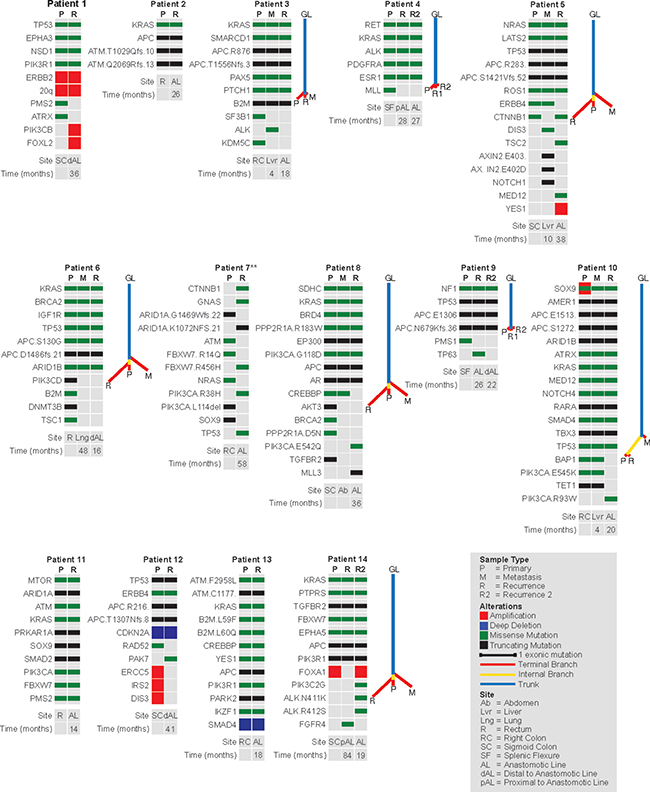 This study was approved by the Institutional Review Board at our institution. We identified 14 patients who developed a recurrence at or close to the anastomosis at least one year following R0 resection of a primary CRC with adequate tissue available both from the PT and the recurrence for genomic analysis. Five patients had tissue available from a DM that developed prior to the AR. Three patients had tissue available from a second AR that occurred after the first AR. A total of 36 samples were analyzed.