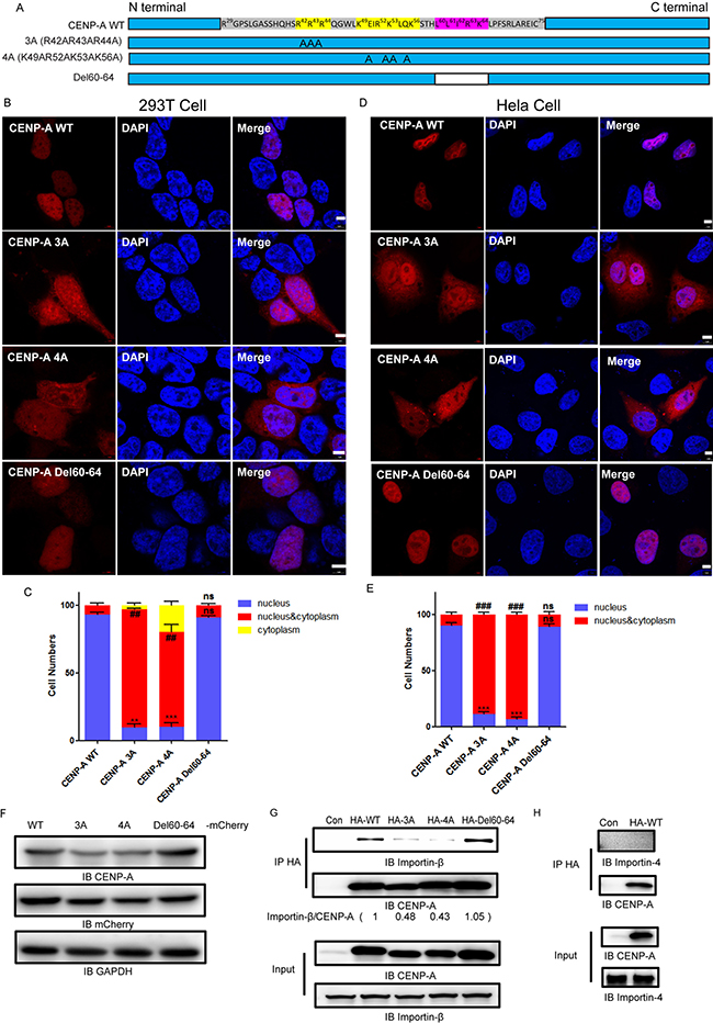 Figure 2: Two motifs, R42R43R44 and K49R52K53K56, are required for nuclear accumulation of CENP-A. (A) A schematic drawing showing the amino acid constituents of R29-C75. Three mutants, R42A R43A R44A (3A), K49A R52A K53A K56A (4A) and Del60-64, were generated. (B, D), The localization of wild-type CENP-A and mutants 3A, 4A and Del60-64 in 293T (B) and HeLa cells (D). Scale bar is 5 μm. C, (E) Statistical results from 100 mCherry-positive 293T (C) and HeLa (D) cells. Nuclear localization (compared to wild type), **p < 0.01, ***p < 0.001. nucleus/cytoplasm localization (compared to wild type), ##p < 0.01, ###p < 0.001. ns, no significance. (F) Western blotting confirmed the expression of mCherry-tagged CENP-A and mutant proteins in 293T cells. (G) CENP-A interacts with endogenous Importin-β. (H) CENP-A does not interact with Importin 4. The western blotting images were quantitated using FluorChem FC3 software.
