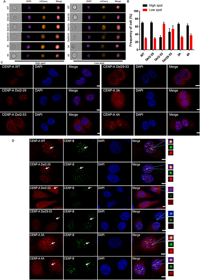 Figure 4: R42R43R44 and K49R52K53K56 were not involved in the centromeric localization of CENP-A. (A) Representative pictures of the high-spot and low-spot population of HeLa cells expressing mCherry-fused CENP-A and its mutants acquired with Amnis® ImageStreamx Mark II flow cytometry. (B) Statistical analysis of the high-spot and low-spot population of CENP-A and its mutants. (C) Centromeric localization of wild-type CENP-A and Del2-29, 3A and 4A mutant proteins. Scale bar is 5 μm. (D) Localization of the endogenous centromeric marker protein CENP-B and wild-type CENP-A, Del2-29, 3A and 4A mutant proteins. Scale bar is 5 μm.