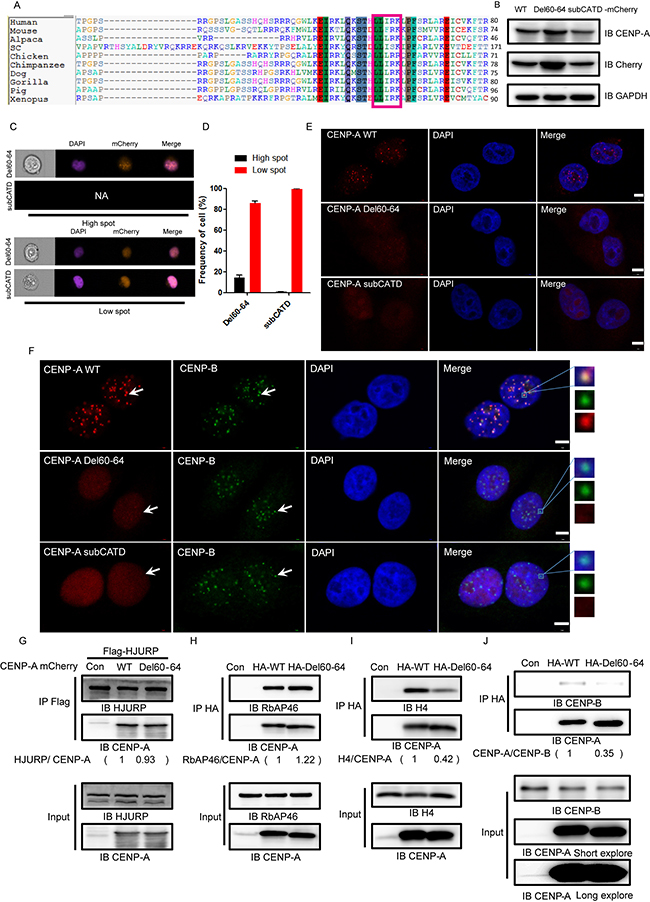 Figure 5: A new motif, L60L61I62R63K64, is required for CENP-A centromeric localization. (A) The protein sequence alignment of the centromere-specific histone variants of histone H3 from different species showing conservation of the L60L61I62R63K64 motif. (B) The expression of mCherry-tagged wild-type CENP-A and the mutant proteins Del60-64 and subCATD in HeLa cells. (C) Representative pictures of the high-spot and low-spot populations of HeLa cells expressing mCherry-fused CENP-A and mutant proteins acquired with ImageStream cytometry. (D) The statistical analysis results of high-spot and low-spot populations of CENP-A and mutants. (E) Del60-64 partially lost centromeric localization,. (F) Localization of the endogenous centromeric marker protein CENP-B and mCherry-tagged CENP-A, Del60-64, and subCATD. Scale bar is 5 μm. (G–J) The association of CENP-A or Del60-64 with HJURP (G), RbAp46 (H), Histone H4 (I) and CENP-B (J).
