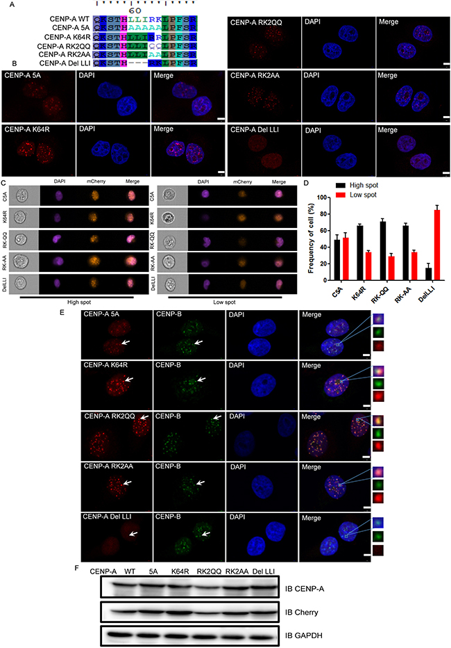Figure 6: L60L61I62 are the most important residues for CENP-A centromeric localization within the L60L61I62R63K64 region. (A) A protein sequence alignment showing the mutants we generated within the motif L60L61I62R63K64. (B) The centromeric localization of the mutant DelLLI was greatly impaired when compared to other mutants with mutation within the region L60-K64. Scale bar is 5 μm. (C) Representative pictures of high-spot and low-spot populations of HeLa cells expressing mCherry-fused CENP-A and its mutants acquired with ImageStream cytometry. (D) The statistical analysis results of high-spot and low-spot populations of CENP-A and its mutants. (E) Localization of CENP-B and CENP-A mutants. Scale bar is 5 μm. (F) The expression of mCherry-tagged CENP-A proteins in HeLa cells.