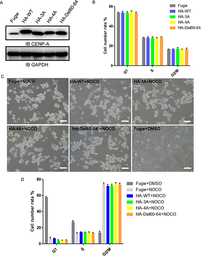 Figure 7: The effect of CENP-A mutants on cell cycle and mitotic arrest. (A) Western blotting confirmed the expression of HA-tagged wild-type CENP-A and mutant proteins in HeLa cells. (B) Cell cycle analysis of HeLa cells with the expression of wild-type CENP-A and mutant proteins for 72 hours. (C) Cells in mitotic arrest expressing wild-type CENP-A and mutants in HeLa cells. Cells were observed using microscopy after treatment with 100 ng/ml nocodazole for 18 hours. Scale bar is 100 μm. (D) The percentages of the G1, S and G2/M populations after 100 ng/ml nocodazole treatment for 18 hours were determined using PI staining and FACS analysis.