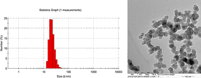 Figure 1: Size of MCyp determined by dynamic light scattering (A) and transmission electron microscope (B).
