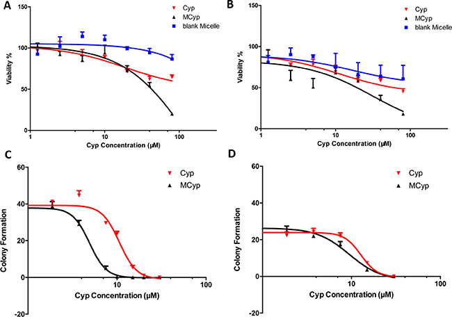 Figure 2: Survival rate of DBTRG-05MG cells (A) and U87 MG cells (B) cultured with Cyp solution, MCyp and the corresponding blank micelles for 48 h. Data are presented as the mean ± SEM (n = 6). Colony formation number of DBTRG-05MG cells (C) and U87 MG cells (D) after different concentrations of Cyp solution and MCyp treatment. Data are presented as the mean ± SEM (n = 3).