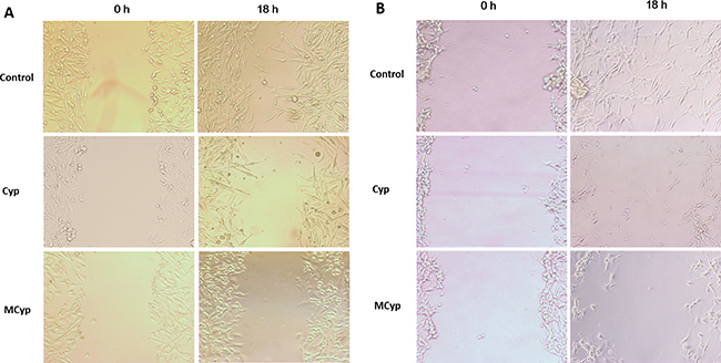 Figure 3: Representative images of the wound healing assay at 0 and 18 h for DBTRG-05MG (A) and U87MG (B) cells. The final concentration of Cyp was 5 μM.