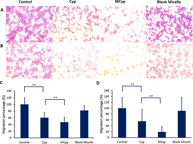 Figure 4: Image of migration of DBTRG-05MG cells (A), U87 MG cells (B) after incubation with Cyp solution, MCyp and blank micelles for 30 h, respectively (magnification 10×). The final concentration of Cyp was 5 μM. Quantitative analysis of the relative percentage of DBTRG-05MG (C) and U87 MG cells (D) migrated compared to the control group. Data are presented as the mean ± SD (n = 17). Asterisks denote significant P < 0.001.