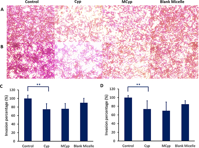 Figure 5: Image of invasion of DBTRG-05MG cells (A), U87 MG cells (B) after incubation with Cyp solution, MCyp and blank micelles for 30 h, respectively (magnification 10×). The final concentration of Cyp was 5 μM. Quantitative analysis of the relative percentage of DBTRG-05MG (C) and U87 MG cells (D) invaded compared to the control group. Data are presented as the mean ± SD (n = 22). Asterisks denote significant P < 0.001.