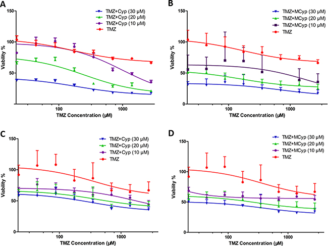 Figure 6: Survival rate of DBTRG-05 MG cells (A, B) and U87 MG cells (C, D) cultured with different concentrations of TMZ and fixed concentrations of Cyp solution (A, C) or MCyp (B, D) for 48 h. Data are presented as the mean ± SEM (n = 6).