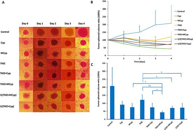 Inhibition of tumor spheroids of the combination of TMZ and Cyp