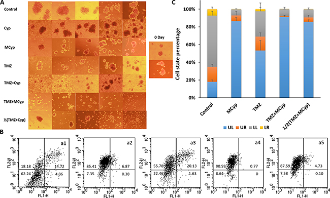 Figure 9: The representative pictures of the DBTRG-05MG neurospheres after treated with of PBS, Cyp solution, MCyp, TMZ, TMZ+Cyp, TMZ+MCyp, and 1/2(TMZ+MCyp). (A) Typical apoptosis profiles (B) and quantitative analysis (C) of the collected cells from the neurospheres after incubated with control (a1), MCyp (a2), TMZ (a3), TMZ+MCyp (a4), 1/2(TMZ+MCyp) (a5). LL, UL, LR and UR quadrant represents viable cells, necrotic cells, early and late apoptotic cells, respectively. Data are presented as the mean ± SD (n = 3).