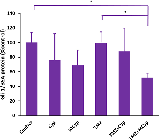 Figure 10: Gli1 protein level of U87 MG cells after treatment of PBS (as control), Cyp solution, MCyp, TMZ, TMZ+Cyp, and TMZ+MCyp. The final concentration of the Cyp and TMZ are 30 μM and 600 μM, respectively. Data are presented as the mean ± SD (n = 3).