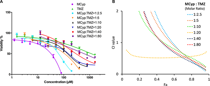 Figure 7: Cytotoxicity study of free TMZ, MCyp and both drug combinations at various molar ratios after 72 h (A) and the corresponding CI vs Fa plot (B) of U87 MG cells. The concentration of the X-axis represents the molar concentration of TMZ, in addition to the MCyp group representing the Cyp concentration. Data are presented as the mean ± SD (n = 6).