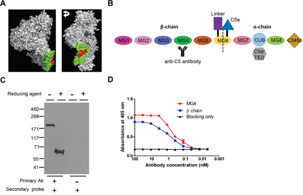 Figure 1: Development of anti-C5 antibody targeting MG4 domain. (A) 3-D structure of C5 (Reference PDB 3CU7). MG4 domain and binding epitope of anti-C5 antibody were identified in green and red, respectively. (B) Schematic diagram of mouse C5 with anti-C5 antibody. (C) Western blot analyses of serum of DBA/1 mouse with anti-C5 antibody in non-reducing and reducing conditions. Representative figures from 3 independent experiments. (D) Binding affinity of anti-C5 antibody to MG4 domain and β-chain of mouse C5 on ELISA (n = 6).