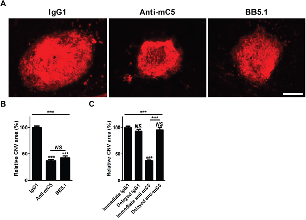 Figure 2: Anti-C5 antibody targeting MG4 domain inhibits laser-induced CNV in mice. (A) Representative photographs of CNV at 7 days after laser photocoagulation and intravitreal injection of IgG1 isotype control, anti-C5 antibody, or BB5.1 demonstrated by immunostaining with isolectin B4-594. Scale bar, 200 μm. (B) Quantitative demonstration of relative CNV areas regarding Figure 2A (n = 12). (C) Quantitative demonstration of relative CNV areas at 7 days after laser photocoagulation. ‘Immediate’ and ‘Delayed’ indicate that antibodies were injected just after laser photocoagulation and 4 days later, respectively (n = 12). Anti-mC5, anti-C5 antibody; IgG1, IgG1 isotype control. NS, P-value > 0.05; ***, P-value < 0.001 (Kruskal-Wallis test with post-hoc Dunn’s multiple comparison test).