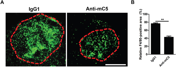 Figure 4: Anti-C5 antibody prevents infiltration of F4/80-positive cells in CNV lesions. (A) Representative photographs of F4/80-positive cells in CNV lesions at 3 days after laser photocoagulation and intravitreal injection of anti-C5 antibody. Red dashed lines delineate CNV areas. Scale bar, 200 μm. (B) Quantitative analyses of relative F4/80-positive areas of CNV lesions (n = 6). Anti-mC5, anti-C5 antibody; IgG1, IgG1 isotype control. **, P-value < 0.01 (Mann-Whitney U-test).