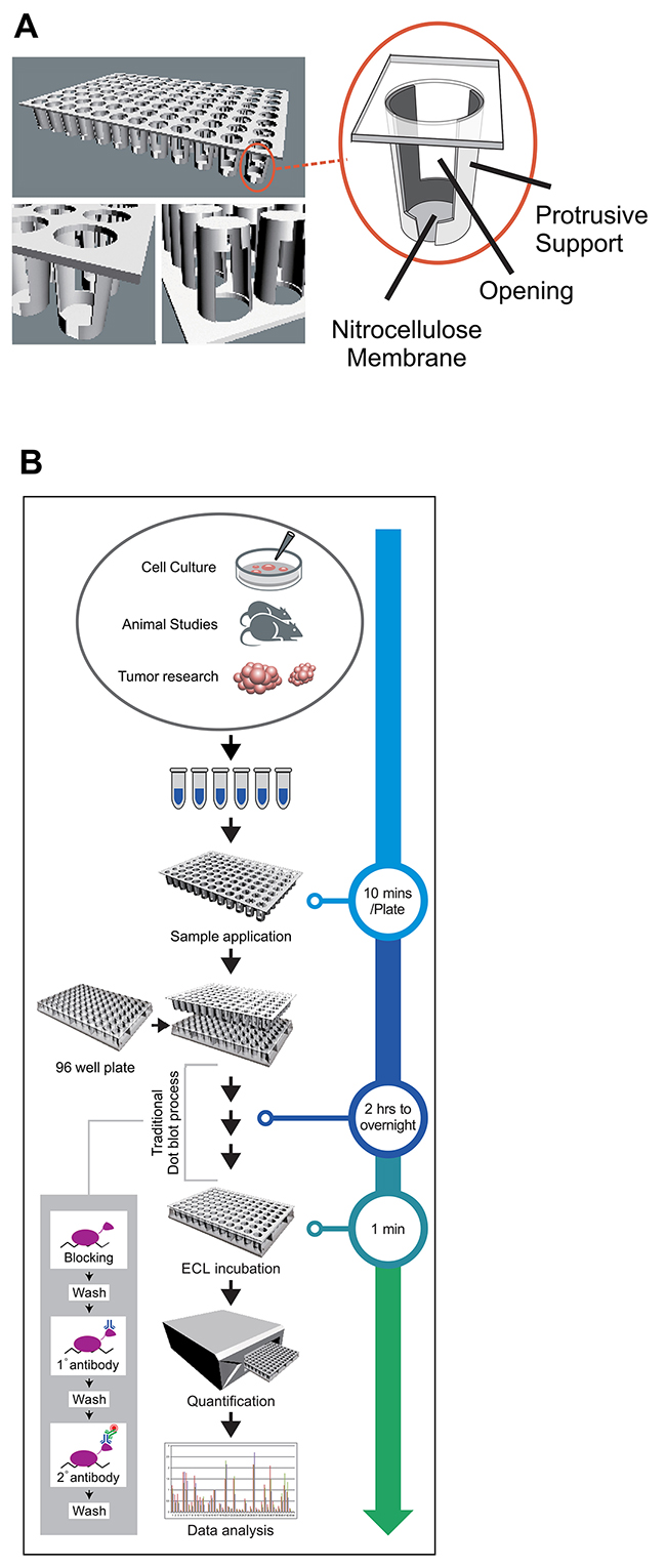 Lacking of an accessible high throughput immun-oblot method significantly hinders any attempts to investigate the molecular basis of biological and pathological processes systematically in an average research lab. Until now, Western blot analysis remains the most commonly used immunoblot tool in the basic research lab almost 40 years since its invention [1-4]. However, its limitations, including complicated processing steps, limited ability to process many samples, ambiguity in result analysis and requirement of large amount of total protein lysate for analysis, determines this technique an unlike choice for high throughput analysis. As an alternative, Dot blot analysis was developed to simplify the process of Western blot analysis [5]. In fact, both enzyme-linked immunosorbent assay (ELISA) [6-8] and reverse phase protein microarray (RPPM) [9, 10] can be considered as Dot Blot analysis in a high throughput format. Nonetheless, the applications of these techniques are still limited in basic research lab for various reasons, including limited availability for prefabricated ELISA kits and lack of easy access to RPPMs.