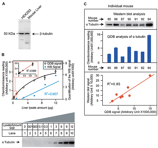 The feasibility of QDB analysis was tested first by analyzing the tubulin content in mouse liver lysates. The specificity of a rabbit anti-tubulin antibody was evaluated in Figure 2A. For dose curve study, we serially diluted lysate from 0.01μg to 12 μg using pooled lysate prepared from 4 mouse livers. QDB analysis yields a linear curve between 0 to 1μg with coefficient of determination (R2) of 0.999 when simple linear regression analysis was performed (Figure 2B, upper panel). Beyond 1 μg, the signal started to reach plateau. In the same study, we could not detect visible signals until 1μg or more of lysate were used in Western blot analysis (Figure 2B, lower panel). Next, we evaluated the results from QDB analysis and Western blot analysis using individual mouse liver lysates prepared from 7 mice. The image from Western blot was quantified and compared with the result from QDB analysis. We were able to obtain R2 of 0.85 when simple linear regression analysis was performed on these two methods (Figure 2C). The inter- and intra-plate coefficient of variance (CV) of the QDB plate were also evaluated using the same antibody, with inter-plate CV at as lower as 4.37% and intra-plate CV at as lower as 5.19% (Supplementary Table 1). We also serially diluted samples prepared from mouse liver, and explored dose curves of several other antibodies. Our results showed that the linear range of the assay was highly dependent on the antibody per se. A further combination of biotin system and reporter enzyme could significantly increase the sensitivity of the assay. For most antibodies, over 20 fold of signal intensity over background can be detected when 0.25 μg to 2 μg sample lysates were used (Supplementary Figure 1).