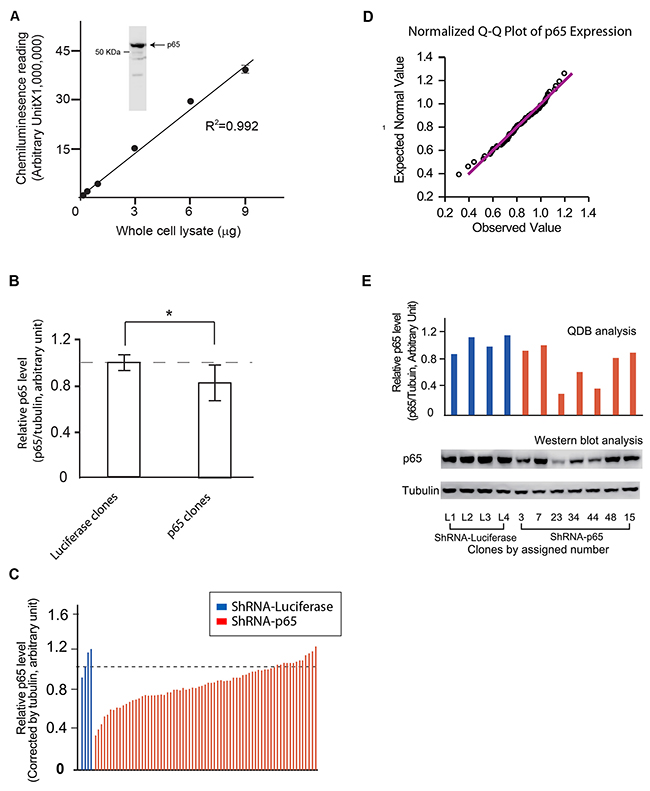 Figure 3: Evaluation of the feasibility of QDB analysis at cellular level. (A) Characterization of anti-p65 antibody. Insert, the specificity of anti-p65 antibody was investigated using cellular lysate prepared with HEK293 cells in Western blot analysis. The whole membrane was scanned using a blot scanner from Li-Cor to ensure only one band with expected molecular weight was observed. A. The whole cell lysate was serially diluted as indicated in the figure, and applied to the QDB plate at 2μL/unit. The plate was processed as described in the Materials and Methods, and the results were analyzed with simple linear regression analysis with R2 at 0.992. (B) Comparison of the relative p65 levels between Luciferase and p65 clones. HEK293 cells were transfected with ShRNA-p65 or ShRNA-Luciferase respectively using Fugene 6 transfection reagent. Stable clones were selected using puromycin at 5 μg/mL from cells transfected with ShRNA-p65 (p65 clones) or ShRNA-Luciferase (Luciferase clones) until they were visible under naked eyes. Clones were picked up and transferred to two 96 well plate at 1:9 ratio (plate A and B for description purpose). Luciferase clones were labeled as L1 to L5, while p65 clones were labeled sequentially. The 96 well plates with a larger portion of cells (plate A) were allow to grow for one or two days before they were collected to prepare for cell lysate as described in the Materials and Methods. The whole cell lysate from individual clone was used for QDB analyses of tubulin and p65 levels, and the relative level of p65 (ratio of p65 level over tubulin level) was used to compare endogenous p65 expression levels in each clone, using the average of the p65 expression levels in luciferase clones as 1. The results were averaged to compare endogenous p65 levels between luciferase and p65 clones at population level. *, p< 0.05 using student T-test. (C) The relative p65 level of all 76 clones, including 5 luciferase clones and 71 p65 clones, was plotted individually. The result presented is the average of three independent experiments in triplicates. (D) The QQ plot analysis of the distribution of the endogenous p65 levels of 71 p65 clones is shown to demonstrate the normal distribution of relative p65 level among p65 clones. (E) Representative clones were picked up from the plates with less cells (plate B) based on the results shown in Figure 3C, and transferred to 60 mm dishes to allow them to reach sufficient cell numbers for Western blot analysis using anti-p65 and anti-tubulin antibodies (Lower panel). The results of QDB analyses of these representative clones from Figure 3C were re-plotted in the upper panel for comparison purpose.