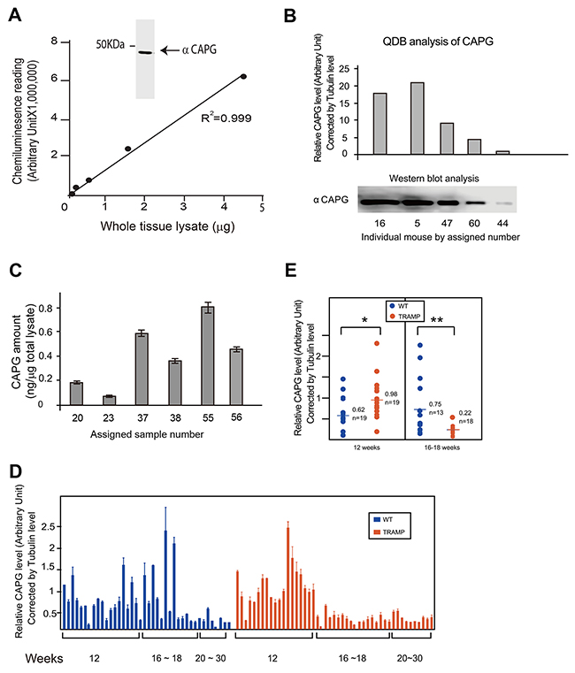 Figure 4: Evaluation of the feasibility of QDB analysis at tissue level. (A) Characterization of Anti-CAPG antibody. Insert, Western blot analysis of anti-CAPG antibody. Mouse prostate tissue lysates were prepared as described in Materials and Methods. Prostate tissue lysates from 6 mice were mixed with equal amount based on BCA measurements, and 40 μg pooled total tissue lysate was used for Western blot analysis. In Figure A, serially diluted pooled mouse prostate tissue lysate was used to define the linear range of the QDB analysis at 2 μL/unit in triplicate. The results were analyzed with simple linear regression analysis with R2 at 0.999. (B) Benchmarking the QDB analyses of relative CAPG levels with Western blot analysis. Prostate tissues were collected from individual mice, as indicated by the assigned number, and whole tissue lysates were prepared as described in the Materials and Methods. For QDB analysis, prostate tissue lysates of 2 μL (around 1 μg total protein lysate per sample) in triplicate were used for the measurement of both tubulin and CAPG levels in individual mice. The relative CAPG level of individual mice, expressed as the ratio of CAPG level over tubulin level, is shown in the upper panel. In the lower panel, the amount of lysate of each sample used for Western blot analysis was adjusted based on the result of QDB analysis of tubulin levels of these samples to allow equal loading, and CAPG levels in these samples were examined using Western blot analysis. For lysate prepared from mouse #44, about 30 μg total tissue lysates were used. In the insert, the Western blot result from the lower panel was quantified using Image Studio Digits from Li-Cor. (C) Measuring the absolute amount of CAPG level in mouse prostate tissues. A dose curve was established using recombinant CAPG protein in Supplementary Figure 3. Samples prepared from prostate tissues of individual mice #20,23,37,38,55 were analyzed side by side in triplicate with the dose study in QDB analysis, and the absolute amount of CAPG were calculated based on the established dose curve. The results were average of 3 independent experiments ± SEM. (D) Prostate tissues from a total number of 87 mice (40 WT, 47 TRAMP) were used to prepare prostate tissue lysates as described in Materials and Methods. The protein concentration was measured by BCA protein determination kit. Total tissue lysates of 3 μl per sample in triplicate (about 1 μg total protein/unit) were used for each mouse for the QDB analyses of CAPG and tubulin levels. The result was plotted by age and phenotype. The results presented are averages of three experiments with each sample in triplicate in each experiment. (E) Comparison of relative CAPG levels by age group in wild type and TRAMP mice. The results were the averages of 19 WT mice and 19 TRAMP mice among 12 weeks old mice and averages of 18 WT mice and 13 TRAMP mice among mice of 16-18 weeks old. *, p<0.05, **, p< 0.01 based on student t-test.