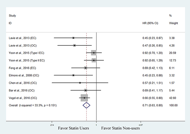 Figure 6: Forest plot of the effect of statin use on progression free survival in endocrine-related gynecologic cancer patients.