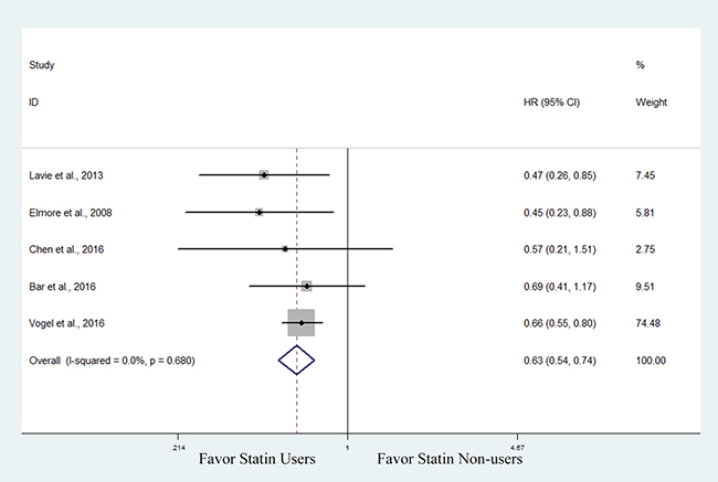 Still, this meta-analysis has some limitations. First, as there were no relevant RCTs in the literature to date, all of the included studies were non-randomized studies. Second, most of the included studies were retrospective in design; thus, it was impossible to eliminate the possibility of recall bias, and the true effect of the statins might be overestimated due to the lack of experimental random allocation to the intervention. Third, 2 abstracts without available full texts were included in our study, which made it difficult to properly assess their methodological qualities. Fourth, some studies did not provide information regarding tumor stage, tumor grade, primary treatments, or the definition of DSS and PFS, which may have introduced a bias. In addition, the method of adjustment for potential confounding factors was not consistent in all of the studies. Even though the multivariate Cox proportional hazards model was employed in most studies, only univariate analysis was applied in the studies without the necessary data. Therefore, our results should be interpreted cautiously, and further prospective randomized trials are required for a more definitive understanding. Finally, the limited number of included studies made it impractical to evaluate the effects of statins according to type, dose, frequency, and duration of use.