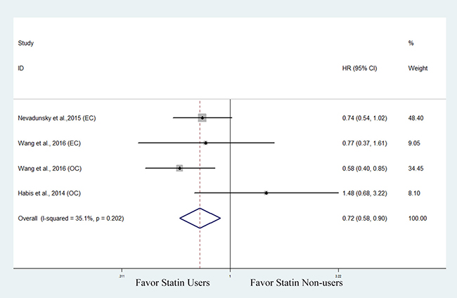 Figure 2: Forest plot of the effect of statin use on overall survival in endocrine-related gynecologic cancer patients.