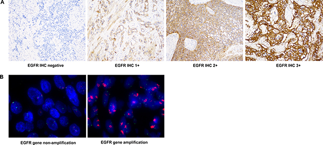 Figure 1: Representative images of EGFR IHC and FISH. (A) EGFR IHC images (400×) for 0, 1+, 2+ and 3+ scores are shown. (B) EGFR FISH staining images (1000×) tumor samples with or without EGFR gene amplification are shown.