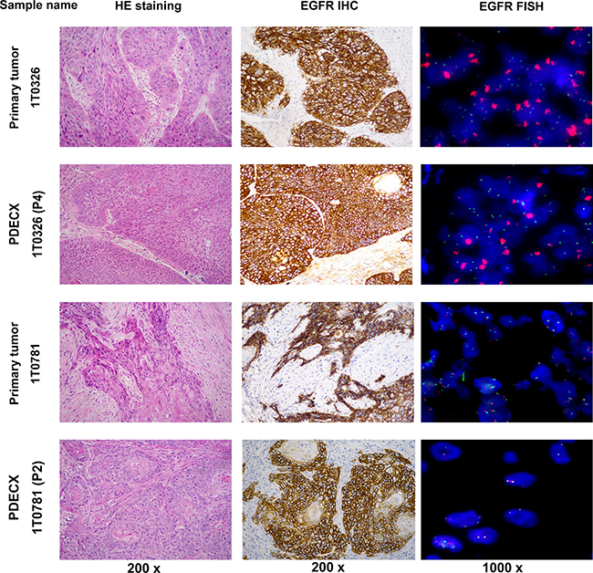 Figure 2: H&E, EGFR IHC and FISH staining of PDECX models and corresponding primary patient tumor specimens. Images of H&E (200×), EGFR IHC (200×) and FISH (1000×) for PDECX 1T0326 (P4) and PDECX 1T0781 (P2) models are shown with the corresponding human primary tumor tissue.