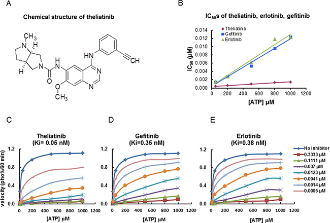 Figure 3: Chemical structure of theliatinib and its enzyme kinetics on EGFR inhibition. (A) Chemical structure of theliatinib. (B) IC50 values of theliatinib, gefitinib and erlotinib were calculated by determining inhibition of wild type EGFR kinase in presence of different ATP concentrations (10~1000 μM) as shown. At all tested ATP concentrations, theliatinib showed lower IC50 compared with gefitinib or erlotinib. (C–E) The effects of different concentrations of theliatinib, gefitinib and erlotinib (0~0.3333 μM) on the reaction velocity of EGFR kinase at different ATP concentrations (10~1000 μM) are shown. The Ki values of theliatinib, erlotinib and gefitinib were calculated using Michaelis-Menten equation in Graphpad Prism software.