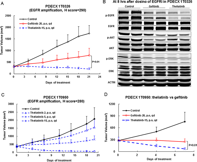 BALB/cASlac-nu/nu nude mice bearing PDECX1T0326 tumors were orally administered with theliatinib (15 mg/kg) or gefitinib (20 mg/kg). After 8 h, the animals were sacrificed and tumors were harvested. The tumors were homogenized in cold lysis buffer (Cell Signaling Technology, 9803) containing 1 mM PMSF (BIO BASIC INC., PB0425) and after centrifuging the lysates, the protein supernatant (containing 100 μg protein) were mixed with 5× SDS loading buffer and boiled at 100°C for 10 minutes and SDS-PAGE was performed (5% stacking gel at 80V for 20 minutes, then changed to 120V on 10% separating gel for 1h). Proteins were then transferred to nitrocellulose membranes (0.35A for 90 minutes), and incubated with the following antibodies individually: Phospho-EGFR (Tyr1068) (Invitrogen, 44788G), EGFR (Cell Signaling Technology, 2232), phospho-AKT (Cell Signaling Technology, 4060), AKT (Cell Signaling Technology, 9272), phospho-ERK (Thr202/Thr204) (Cell Signaling Technology, 4370), ERK (Cell Signaling Technology, 4695). After washing with the 1X TBST, the blots were incubated with the secondary IRDye 800-conjugated secondary antibody (LI-COR, 926-32211) and detected with chemiluminescence system.