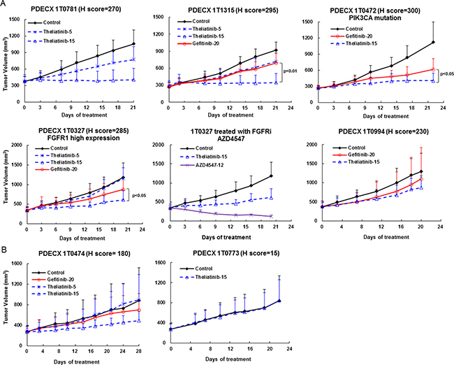 Figure 5: Anti-tumor efficacy of theliatinib in PDECX models without EGFR gene amplification. (A) Anti-tumor effects of theliatinib (5 or 15 mg/kg/day), gefitinib (20 mg/kg/day) are compared against negative control in PDECX models 1T0781, 1T1315, 1T0472, 1T0327 and 1T0994 with EGFR H score > 200. Also shown is 1T0327 with AZD4547 (FGFR inhibitor) compared to theliatinib treatment. (B) Theliatinib shows low or moderate anti-tumor activity in PDECX models 1T0474 and 1T0773 with EGFR H score < 200.
