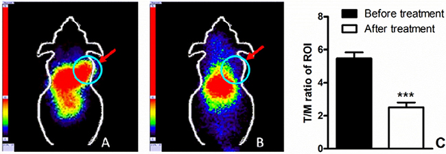 Figure 3: (A) 200 uci of 99mTc-HYNIC-MPG was injected via the tail vein, 2 h later, SPECT imaging was performed on PC9 xenografts; (B) 100 mg/Kg PD153035 was injected before SPECT imaging; T/M ratio before and after treatment was shown in (C).