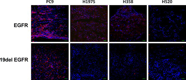 Expression levels of wild type EGFR and EGFR exon 19 E746-A750 deletion proteins were quantified in PC9, H1975, H358 and H520 NSCLC tumors by western blot assays and immunofluorescence staining (Figure 5 and Figure 6). PC9, H1975 and H358 all express EGFR protein, but PC9 also expresses EGFR 19 deletion protein, suggesting that the high uptake of 99mTc-HYNIC-MPG in PC9 is likely due to the presence of EGFR exon 19 E746-A750 deletion protein.