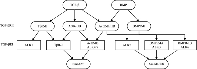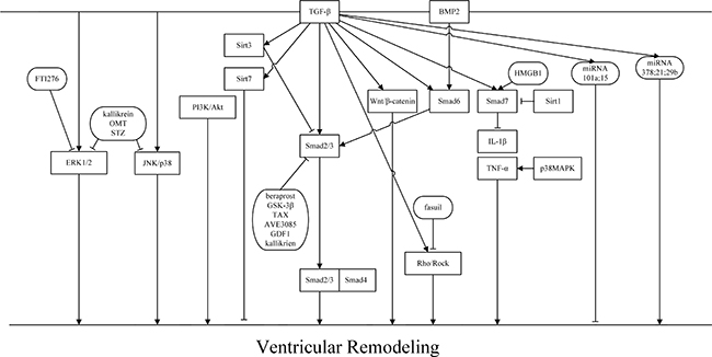Ventricular remodeling (VR) is a complicated process involving cardiomyocyte hypertrophy, inflammation, fibrosis and occurs in response to changes in mechanical and neurohormonal stimulation [1]. VR is characterized by progressive ventricular dilatation, myocardial hypertrophy, fibrosis, and deterioration of cardiac performance, and arises from interactions between adaptive modifications of cardiomyocytes and negative aspects of adaptation such as cardiomyocyte death and fibrosis. VR is defined as structural changes in the left ventricle with three major patterns: concentric remodeling, eccentric hypertrophy, and myocardial infarction [2]. Transforming growth factor β (TGF-β) primarily signals through TGF-β type I receptor (TβRI), also named activin receptor-like kinase (ALK), TβRII and TβRIII. TβRI and TβRII have intrinsic serine/threonine kinase activity and mediate the downstream effects of TGF-β. Recent studies have demonstrated that TGF-β plays a critical role in the regulation of cell growth, differentiation and immune function. In cardiac, TGF-β binds to a complex of type II-R and type I-R (=ALK5), and activin or myostatin, which bind to ALK4, 5, or 7 and active Smad 2 and 3. BMP, which binds to BMPR-II, and ALK2, 3, or 6 and activates Smad 1, 5, or 8 [3] (Figure 1). Sustained pressure overload induces cardiac myocyte hypertrophy and dysfunction along with interstitial changes such as fibrosis and reduced capillary density which are facilitated by TGF-β. The final step in the process of heart failure after pressure overload and myocardial infarction (MI) is cardiac fibrosis which is regulated by TGF-β [1]. TGF-β have received increased and deserved attention in recent years because it may play a potentially novel and critical role in the development and progression of myocardial fibrosis and the subsequent progression of VR. The activation of TGF-β promotes myofibroblast differentiation and transformation, enhances the expression of extracellular matrix (ECM) which participates in a collagen-based scar formation; and inhibits the expression of matrix metalloproteinases (MMPs), which specifically restrains ECM and decrease VR. In this review, we focus on the most extensively investigated TGF-β in VR, and we discuss representative TGF-β signaling pathways and their respective effects on VR. This review we discusses the smad-dependent signaling pathway, such as TGF-β/Smads, TGF-β/Sirtuins, TGF-β/BMP, TGF-β/miRNAs, TGF-β/MAPK, and Smad-independent signaling pathway of TGF-β, such as TGF-β/PI3K/Akt, TGF-β/Rho/ROCK,TGF-β/Wnt/β-catenin in the cardiac fibrosis and subsequent progression of VR. (Figure 1).