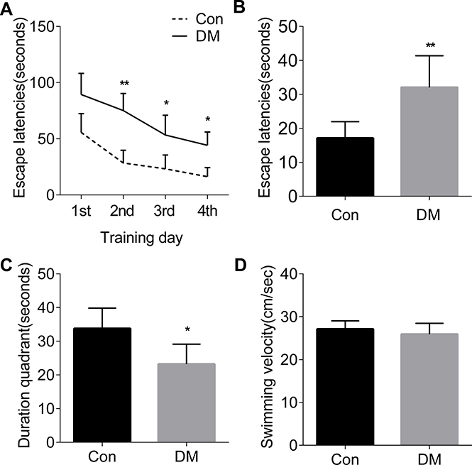 Figure 1: The spatial learning and memory deficits in diabetic rats. (A) The rat learning acquisition. (B) The spatial learning acquistition. (C) The spatial memory retrieval. (D) The swimming velocity. Con, normal control rats; DM, diabetic rats. *p < 0.05, **p < 0.01 vs Con. Error bars represent s.e.m.