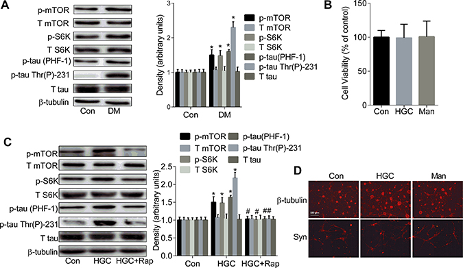 Figure 2: The up-regulated mTOR/S6K signalling causes the formation of tau hyperphosphorylation. (A) Western blot analysis showed the expression levels of tau phosphorylation and the phosphorylation of mTOR and S6K in the hippocampi of control and diabetic rats brains. (B) Cell viability was assessed by CCK-8 assay. (C) Western blot showed the levels of tau phosphorylation and the phosphorylation of mTOR and S6K in primary hippocampal neurons exposed to 25 mM glucose (Con), 50 mM glucose (HGC) or 50 mM glucose and 200 nM rapamycin (HGC + Rap) for 6 days. (D) The morphology of hippocampal neurons was analyzed by immunofluorescence using anti-β-III tubulin and anti-Syn antibodies. *p < 0.05 vs Con; #p < 0.05 vs HGC. Error bars represent s.e.m.